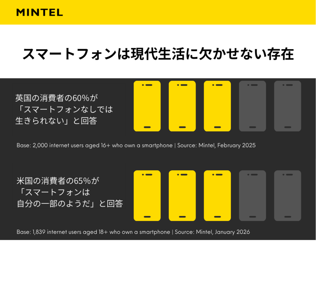 スマートフォンは生活に欠かせないツールである一方、ストレスの源にもなっています。現代生活に不可欠であり続ける一方で、その中心的な役割が緊張感も生み出しています。英国では10人に6人が「スマホなしでは生活できない」と答え、また米国では消費者の約3分の2が「スマホは自分の延長」と捉えています。こうした結果は、デバイスへの依存の深さを示しています。
