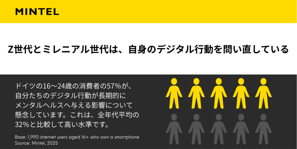 同様にドイツでも、16〜24歳の57%が、デジタル習慣が長期的にメンタルヘルスへ与える影響を懸念しています。全世代平均(32%)と比べても高い水準です。