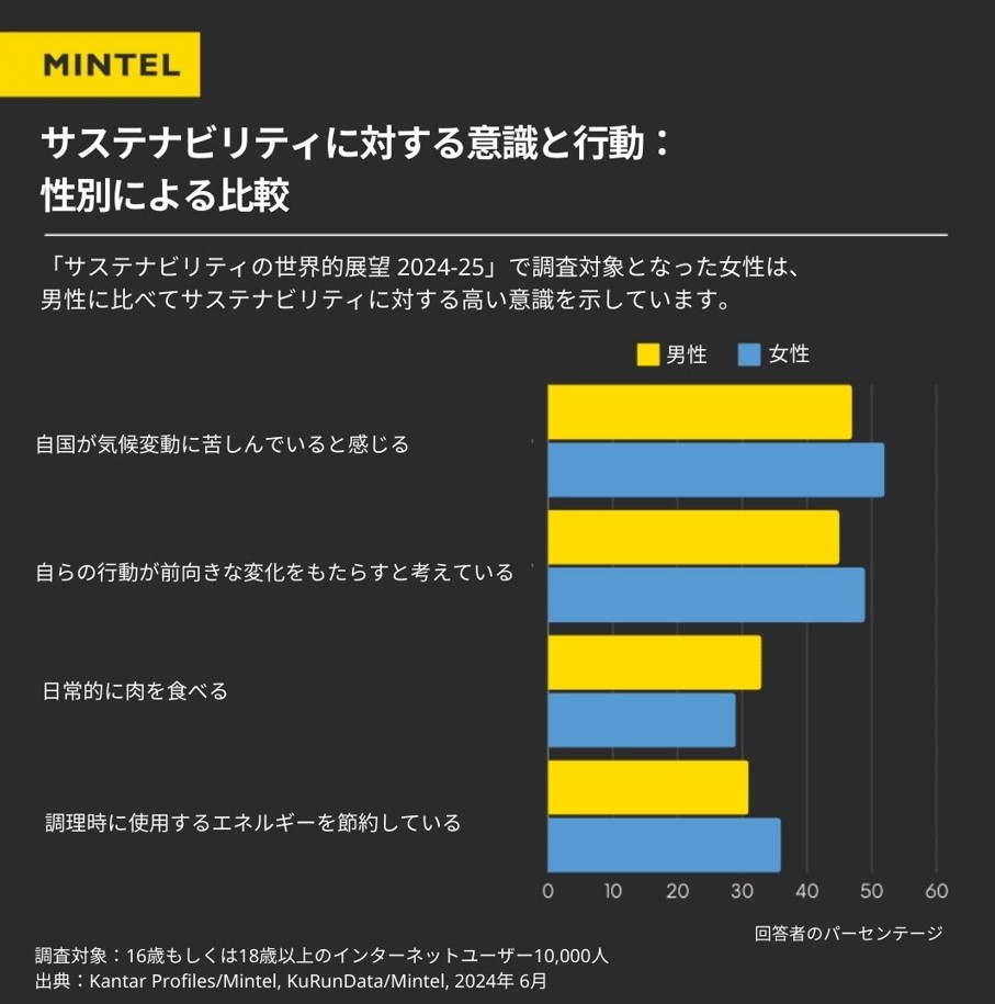 こうした意識の高さは、リサイクルなどのサステナビリティ活動への積極性に表れていると考えられ、リサイクルの実践率では7ポイントのリード、調理時の省エネ行動では5ポイントのリードを示しています。さらに、彼女たちの意識的な消費行動は食生活にも表れており、日常的に肉を消費する割合が男性よりも4ポイント低いことが明らかになりました。