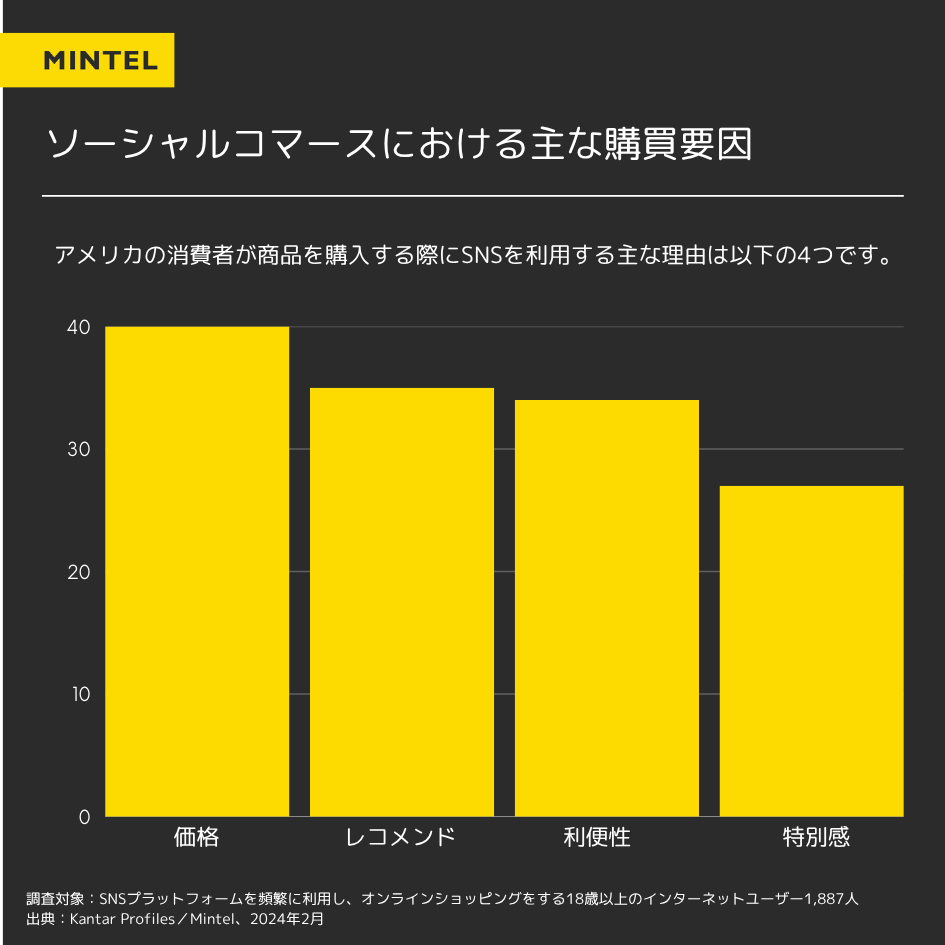 買い物客にとって価値や価格が最優先事項となっている現代では、「特別価格」戦略が人々の関心を誘い、SNSでも購買要因のトップの一つになっています。ブランドはこの戦略を活用することで、SNSでのショッピングが持つさまざまな可能性に見込み顧客を引き込むことができるだけでなく、顧客にブランドとの継続的な関わりを促すことで、今後の特典や商品を見てもらうよう誘導することもできるでしょう。