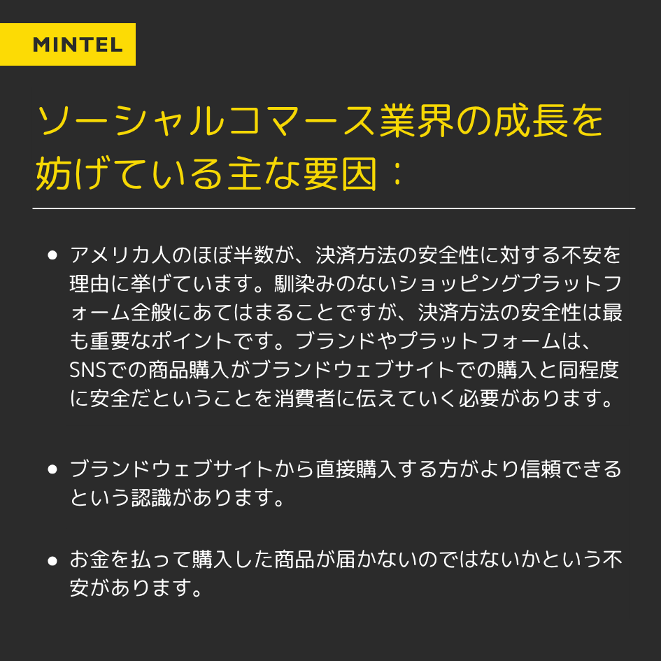 上記すべての障壁の中心にはソーシャルコマース全体に対する信頼感の欠如があるため、小売業者は個人データの利用、商品の真贋(しんがん)、そして認証をとりまく信頼性の問題に対処していくことが最も重要になるでしょう。