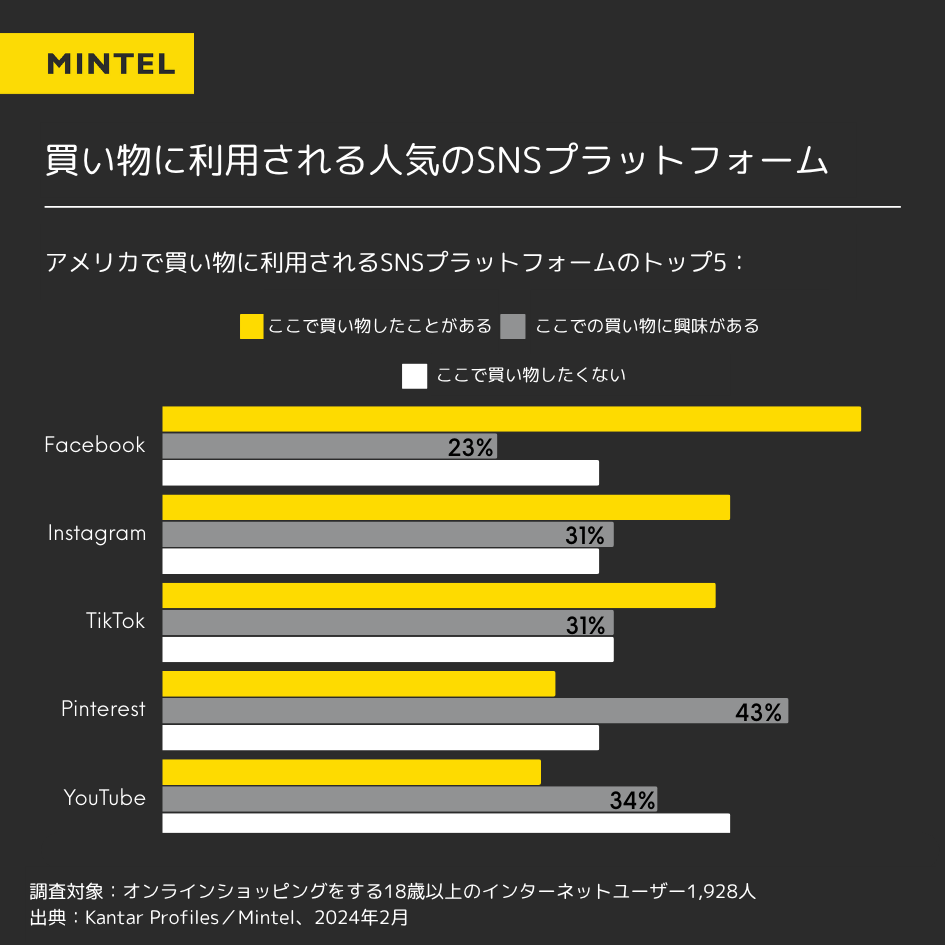 Pinterestはプラットフォーム全体のランキングでは4位となっていますが、まだ利用したことがない人でも安心して買い物できるプラットフォームとしては、購入者から最も高く評価されています。もともとユーザーが自分の理想を表現し、将来の買い物のインスピレーションを探る場所として立ち上げられたPinterestは、その本来の目的をさらに高めていくことで、将来の理想を実際の購入へとつなげることができるでしょう。FacebookやInstagramはもともと他者とつながり、生活の一部を共有する場として作られたものですが、これこそ一部の人々がこれらのプラットフォームの新しいソーシャルコマース要素に足を踏み入れるのをためらう理由かもしれません。