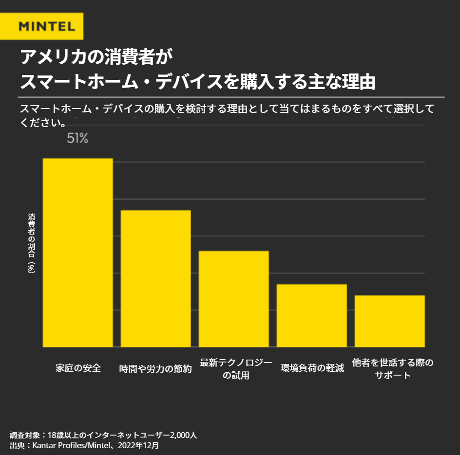 スマートホーム市場は、特に侵入者や不審行動といった、安全上の懸念に対処することにも取り組んでいます。脅威を検知し、防止するスマートセンサーやアラームといったイノベーションが登場し、ホームセキュリティを強化する効果的なソリューションを提供しています。ミンテルトレンドでは、スマートホームセキュリティのブランドであるRingが、スマートアラームを通じてスマートドアベルのセキュリティを強化していることを強調しています。これらのアラームは、センサーによる動作検知がない場合でも、トリガーされると自動的にドアベルのカメラを起動します。高度な安全機能による安心感に加え、スマートセキュリティシステムが住宅保険料の引き下げにつながる可能性があることから、スマートホーム・テクノロジーへの投資は消費者にとって魅力的な選択肢となっています。