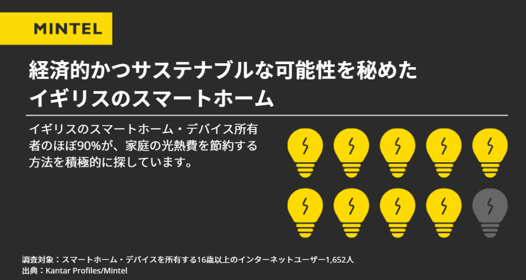 スマートホーム・テクノロジーは、スマート室温計やスマート水道メーターなどのデバイスを通じてエネルギー効率を高めることで、サステナビリティ向上に貢献する可能性を秘めています。これは、環境意識の高い消費者を惹きつける可能性があり、実際、ドイツでは5人に2人以上の消費者が、スマートホームは家庭による環境負荷を削減につながり、サステナビリティ目標達成に役立つと考えています。さらに、この進歩は、特にイギリスのようにエネルギー危機に直面している地域において、エネルギーとコスト削減の目標達成にも貢献します。エネルギー価格の上昇に伴い、消費者はエネルギー管理機能を備えたスマートホーム・デバイスへの関心を高めています。ミンテルの「UK Connected Living and Device Ecosystems Report」によると、消費者の86%が光熱費の節約に積極的に取り組んでいます。これらの消費者の優先事項は、イギリスをターゲットとする企業にとって、エネルギー管理を促進し、スマートホームデバイスが副次的にコスト削減に役立つことを強調する機会となります。このアプローチでは、消費者にエネルギー使用量の可視性を高めることで、スマートホーム・テクノロジーの高額な導入費用が受け入れられやすくなる可能性があります。