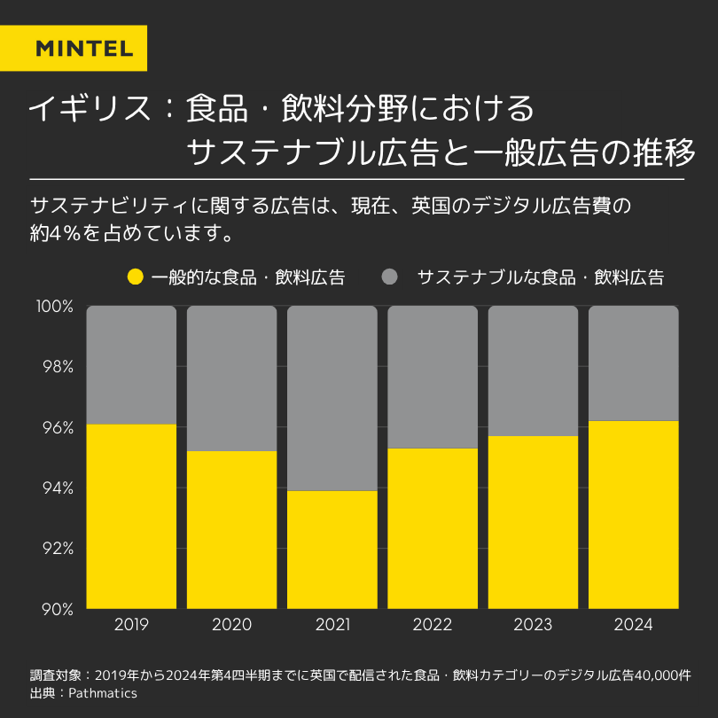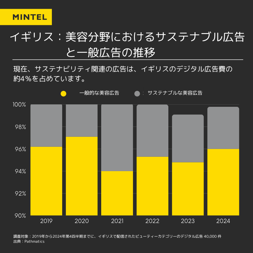 しかし、サステナビリティは消費者にとって引き続き重要なポイントです。例えば、イギリスの消費者では73%が「環境にやさしい行動をとるようにしている」と回答しています(リンクはミンテルのクライアントのみ閲覧可能)。こうした取り組みはブランドのコミュニケーション方法にも反映されており、ミンテルのマーケットインテリジェンス分析によると、2024年のデジタル広告費の4%をサステナビリティ関連訴求が占めています。