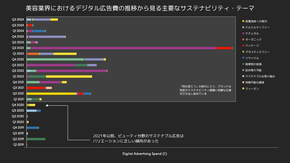 キャッチコピーに含まれるトピックに基づきサステナブルな広告をグラフ化すると、食品・飲料と美容業界の両方で「特化型エコ」へのシフトが顕著に見られます。食品・飲料業界では、2019年にプラントベースブームが本格化しました。2024年には、プラントベースが引き続き上位トピックではあるものの、環境にやさしいパッケージや責任ある農業も話題に上がるようになりました。美容市場における主なエコ訴求、クリーン訴求も進化しています。「クリーンガール」トレンドに見られるオーガニックでナチュラルな製品への需要を受けて、2023年には「ナチュラルさ」をめぐる広告がピークを迎えましたが、2024年には詰め替え製品が主流になりました。