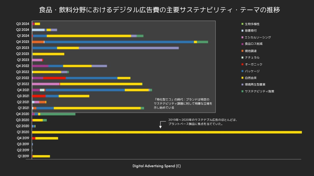サステナビリティをめぐるマーケティングコミュニケーションで取り上げられるテーマを分析すると、時代とともに人々の意識がどのように変化してきたかを探ることができます。コロナ渦で優先順位が下がっていた時期を除き、ブランドは一貫してデジタル広告費の一定割合をサステナビリティに割り当てていることから、こうしたトピックを宣伝することに引き続き商機があると考えられていることが分かります。