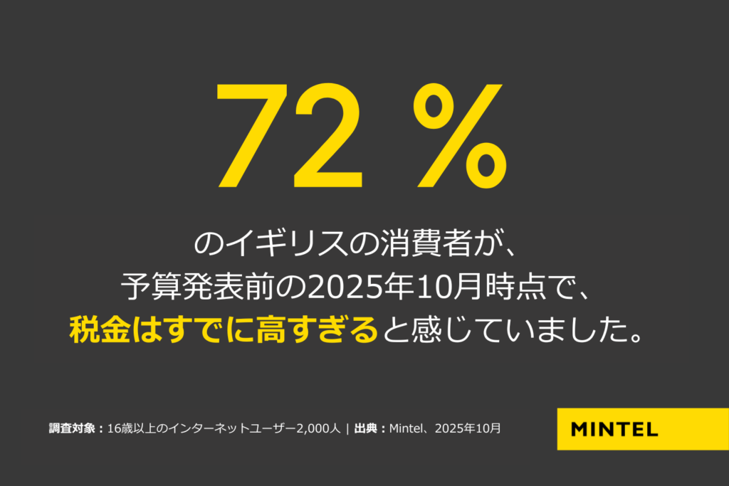 10月時点で「政府から支援されている」と感じている消費者はわずか24%、「すでに税金が高すぎる」と回答したのは72%(リンクはミンテルのクライアントのみ閲覧可能)だったことから、今回の予算案に至るまでに緊張感はすでに高まっていました。予想を下回る生産性や成長率予測を受け、リーブス氏は財政上のギャップを埋め合わせなければならない課題に直面することとなりました。その結果、2030年までの間に追加で260億ポンドの増税が見込まれています。