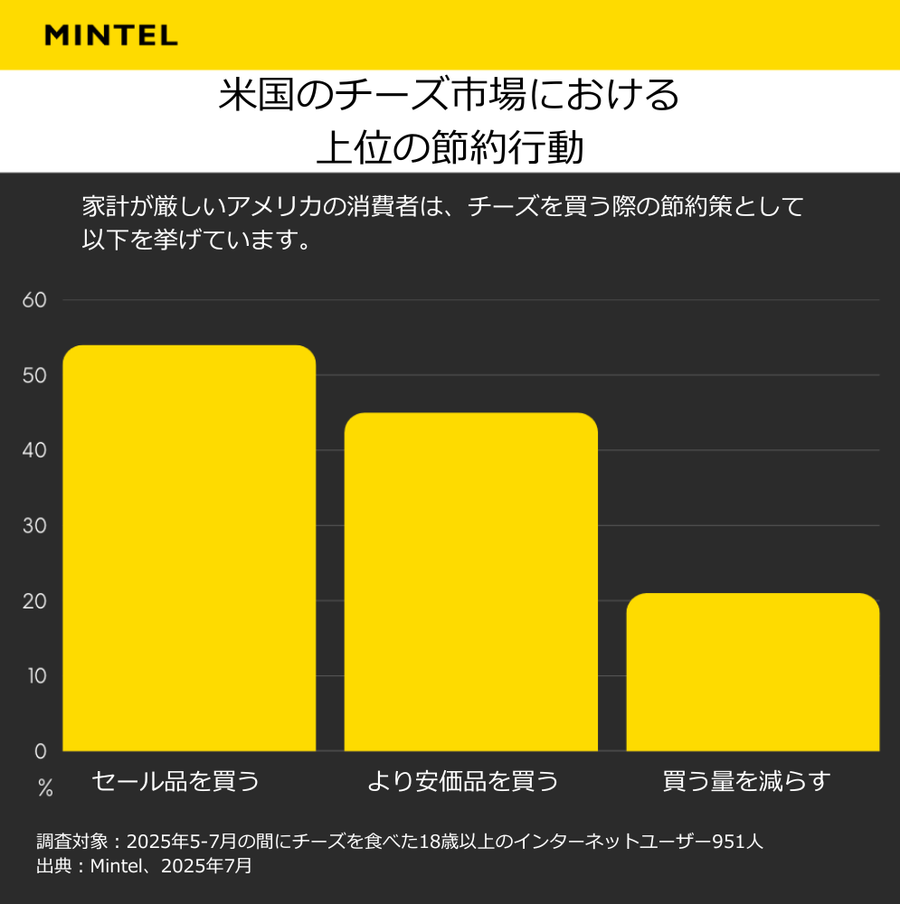 チーズがそれほど定着していない市場では異なる動きが見られます。チーズが定番品として定着していない日本では、価格上昇がより直接的に消費減少を招いており、26%以上の消費者が値上げを受けて消費を減らしています(リンクはミンテルのクライアントのみ閲覧可能)。