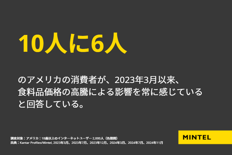 インフレによって、アメリカの消費者の多くが食品・飲料の価格を強く意識するようになっています。多くの消費者は、関税のように世界情勢に関わる問題に起因していたとしても、価格上昇の正当性をいち早く指摘し、疑問視するはずです。
