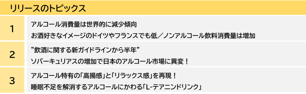 そんな背景から、低/ノンアルコール飲料が脚光を浴びており、同カテゴリー商品も増加傾向にあります。本レポートは、同カテゴリー商品群において、日本でトレンドになりそうなトピックを調査・分析しています。ノンアルコール飲料では、単に味や香りを模倣するだけでなく、アルコールの効果までを再現する製品が登場し、商品開発も新たな段階に入っています。また、より健康志向が高まる生活者の中では、「L-テアニンドリンク」が、アルコールオルタナティブ(アルコール飲料の代替品)として注目されています。猛暑が続く夏の時期、アルコールに代わり「L-テアニンドリンク」を飲むことで熱帯夜を快適に過ごすことができるかもしれません。 本レポートでは、消費者がどのような低/ノンアルコール飲料を求めているのか、市場トレンドにも触れながら明らかにしています。
