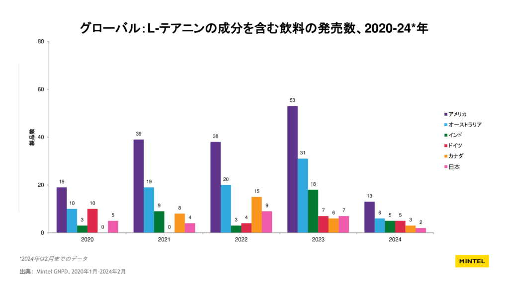 また、アメリカをはじめとした欧米諸国や日本では、リラックス感を再現するために、L-テアニンを含む製品が増えており、ストレス解消効果を訴求する商品が市場に登場しています。L-テアニンは、アミノ酸の一種でリラックス効果や睡眠の質改善に効果があり緑茶にも含まれる成分です。ミンテル 世界新商品データベース(GNPD)によると2020年以降、欧米を中心にL-テアニンを含む飲料の数は増加しており、アルコール代替品として位置づけが意識された商品も増加しています。