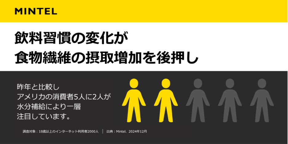 消費者が食物繊維についてより深く理解するにつれて、消費者が食物繊維の摂取量を徐々に増やすためのサポートやアドバイスが必要になります。例えば、週に5gずつ増やしたり、消化器系で食物繊維がスムーズに行き渡るよう健康的な水分補給を促したりといったサポートです。多くの米国の消費者は水分補給に積極的に取り組んでおり、39%が昨年と比べて水分補給に重点を置くようになったと回答しています。