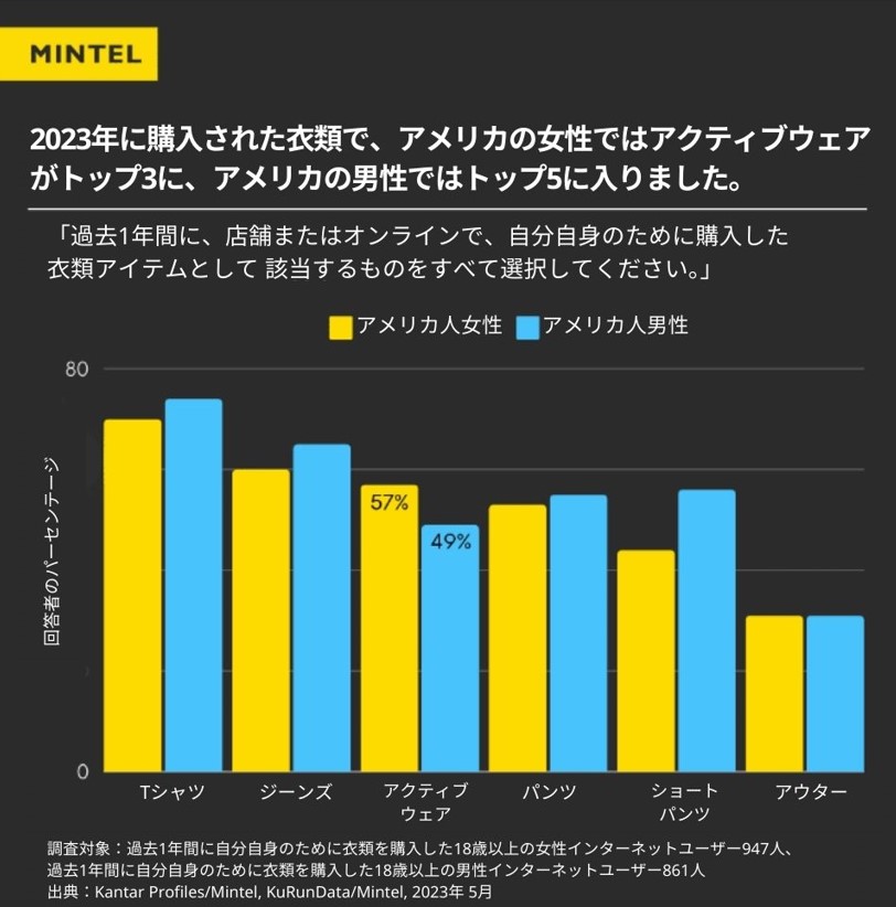 ファッションのカジュアル化は今に始まったことではありません。2010年代半ば以降には運動とレジャーを融合させた「アスレジャー」がファッション業界に革命を起こしてきました。しかし近年、消費者は日々のファッションにスポーツウェアをより頻繁に取り入れるようになっています。これはスポーツウェア市場の持続的な成長にもつながっており、フィットネスとファッションの境界線を曖昧にする動きもその追い風となっています。ミンテルの消費者調査によると、アクティブウェアを購入するアメリカの消費者は2022年以降増加しており、2023年には、アメリカの女性に最も人気の高い商品として、定番のTシャツ、ジーンズに次いでアクティブウェアが3位にランクインしています。ヨーロッパでは、ドイツ最大級のスポーツ小売販売ネットワークであるIntersportとSport 2000が、2022年に過去最高の販売額を達成しました。中国でも、同じくスポーツウェア業界のビジネスチャンスが拡大しており、今後も明るい市場展開が期待されています。