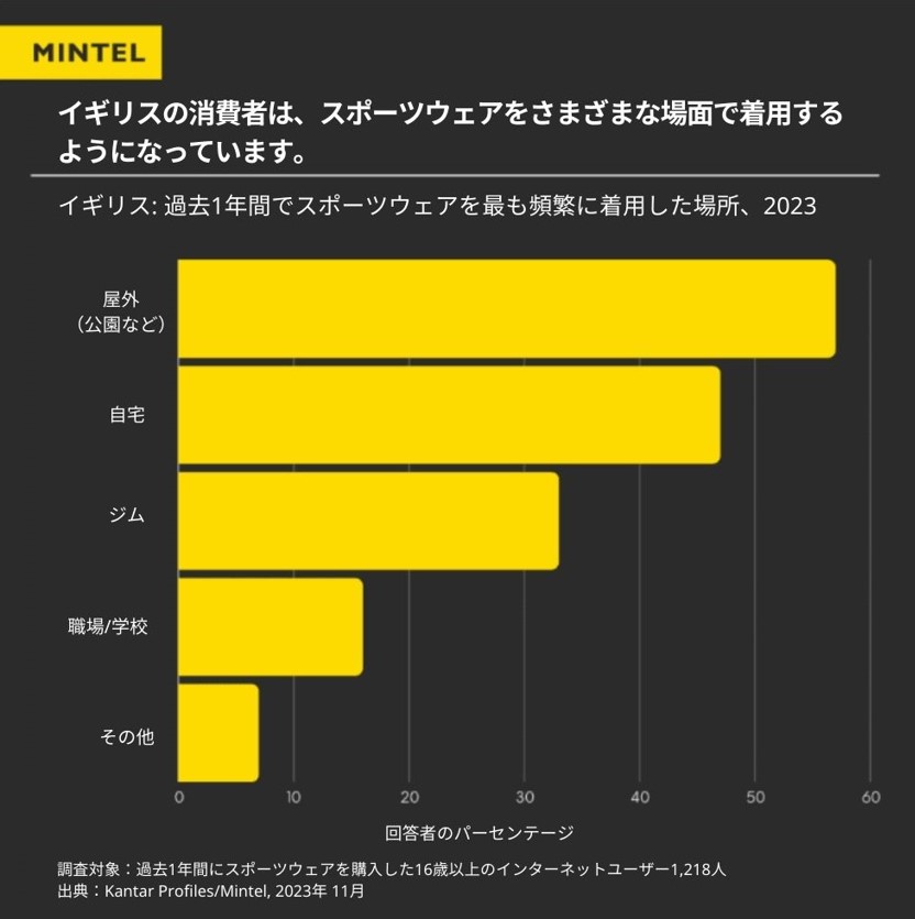 アスレジャー業界が台頭する以前、スポーツウェアを家の中で着るというのは多くの人にとって体調不良の場合に限られたものでした。しかし、こうした常識はすっかり変化し、ジムに行く時だけスウェットパンツをはくといった想定はもはや時代遅れとなっています。ミンテルの最新の消費者調査によると、調査対象となったイギリスの消費者のうち、半数近くが自宅でスポーツウェアを着用しています。また、スポーツウェアから影響を受けやすいのはカジュアルファッション市場だけでなくなっており、最近では高級ファッションブランドもスポーツウェアやレジャーウェアの要素をコレクションに取り入れており、スポーツウェアがアパレル業界のあらゆる側面で活用されていることが明らかとなっています。