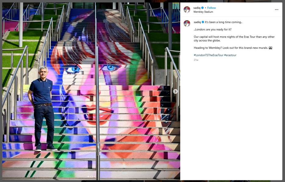 ロンドンはウェンブリーでの8公演(「The Eras Tour」では1都市で最多)を祝うために、あらゆる手を尽くしました。ロンドン市長のサディク・カーン氏は、ロンドン公演の開幕に合わせて、ウェンブリーパークに新たに設置されたアート作品を紹介する投稿をInstagramに公開しました。