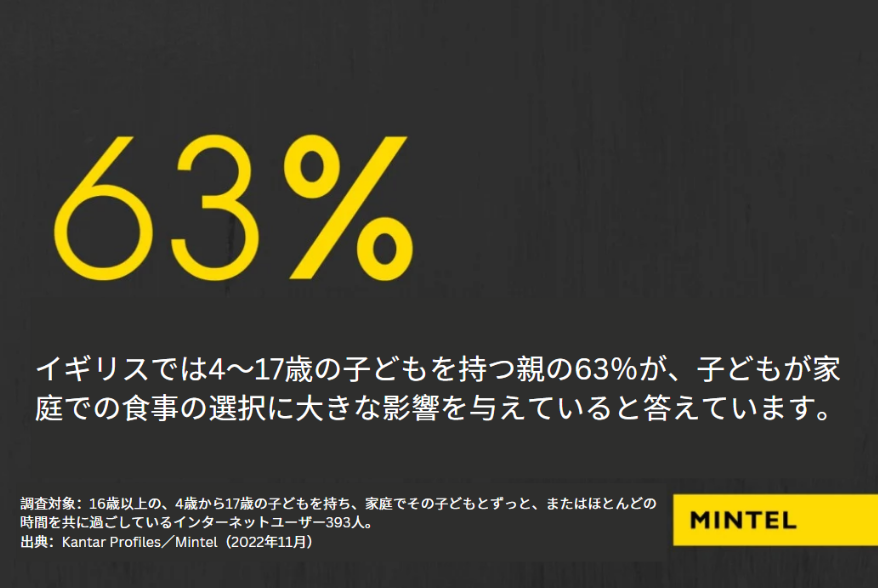 アルファ世代はまだ若い世代でありながらも、育児やメンタルヘルスに関する革命の真っ只中で成長しており、彼らの意見が重視され、家庭での意思決定にも大きな影響を及ぼしています。ミンテルの調査によると、イギリスでは4~17歳の子どもを持つ親の63%が、子どもが家庭での食事の選択に大きな影響を与えていると回答しています。