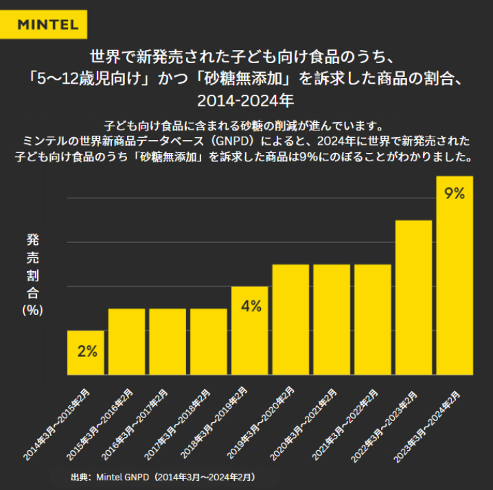 さらに、パンデミックの影響により、ビタミン・ミネラル・サプリメント(VMS)の利用が増加しました。ミンテルの世界新商品データベース(GNPD)によると、2024年に発売された世界の子ども向け食品の28%が、ビタミンやミネラルの強化を謳ったものでした。