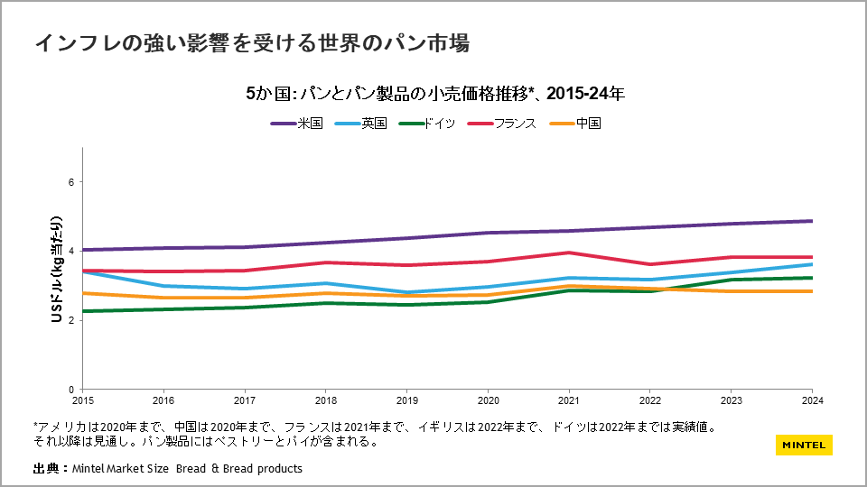 *アメリカは2020年まで、中国は2020年まで、フランスは2021年まで、イギリスは2022年まで、ドイツは2022年までは実績値。それ以降は見通し。パン製品にはペストリーとパイが含まれる。