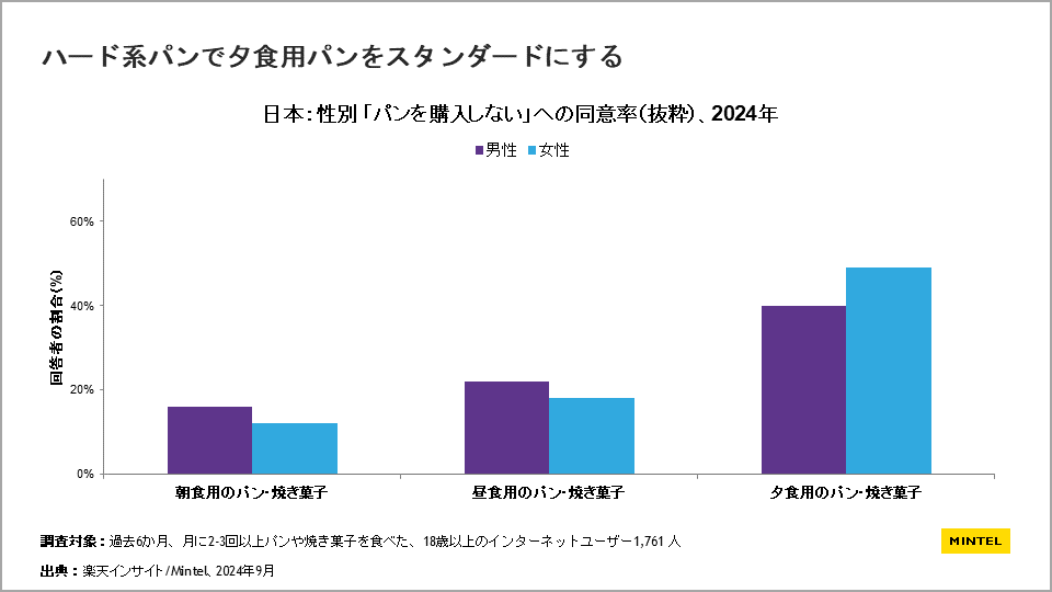 こうした中で見えてきたのが、夕食にパンを提案するという未開拓の可能性です。ミンテルの調査では、夕食用のパン・焼き菓子を購入しない人が、女性では約半数を占め、特にスープやおかずと食べることが多いハード系パンは年齢問わずあまり食されていません。この状況を打開する鍵として、和食との相性を高めた「出汁パン」など新たなパン開発が進行中です。多様なパンを好む日本人のニーズに応えながら、「朝ごパン」から「晩ごパン」へと消費シーンを拡大することが、ベーカリー市場の未開拓領域を切り開く新たな成長戦略として注目されています。
