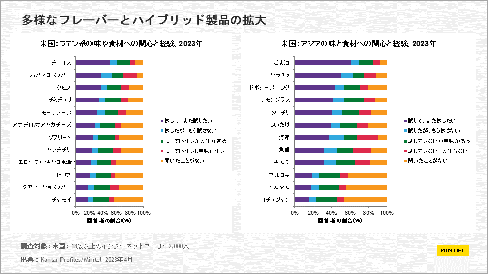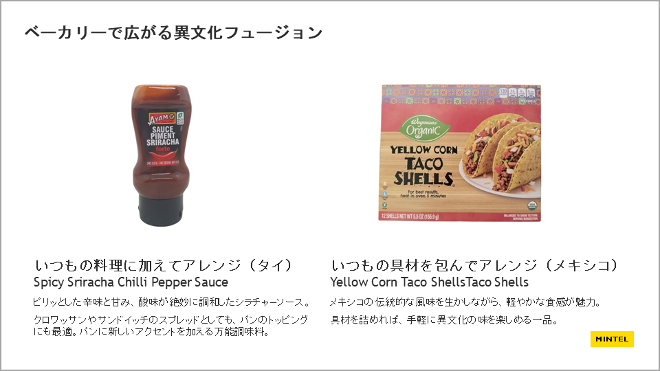 また、異なる食文化を融合させたハイブリッド製品が、特に若年層の間で高い人気を集めています。新たな味の発見につながり、新鮮な体験をもたらすこのトレンドによって、市場が活性化。食品業界では、革新的なフレーバーや製品開発の可能性が広がっています。