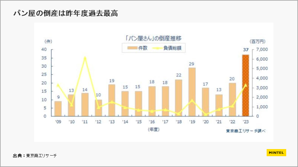 パンの需要は伸びているものの、その一方でパン屋(パン製造小売)の倒産も急増しています。コロナ禍ではテイクアウト需要が手伝って好調でしたが、2023年度のパン製造小売の倒産は前年度比85%増と1年で約2倍に増えており、過去最多を記録しています。物価高がパン屋の経営を直撃したことも要因の一つです。ロシアによるウクライナ侵攻によって、パンの原材料である小麦の価格が高騰し、またそのほかバターや牛乳なども軒並み価格が上昇。コスト上昇分を価格に転嫁しづらいこともあり、パン屋が健全な経営を続けていくには課題が山積みです。