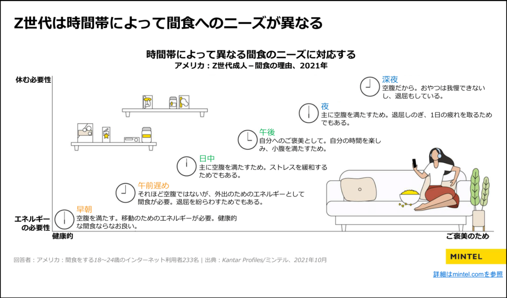 最後のセクションでは、Z世代にとって間食は食事を妨げるものではなく、間食も「食事」であるとし、時間帯ごとに変化する間食のニーズについて説明しました。
