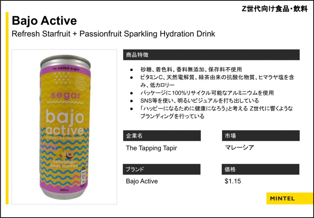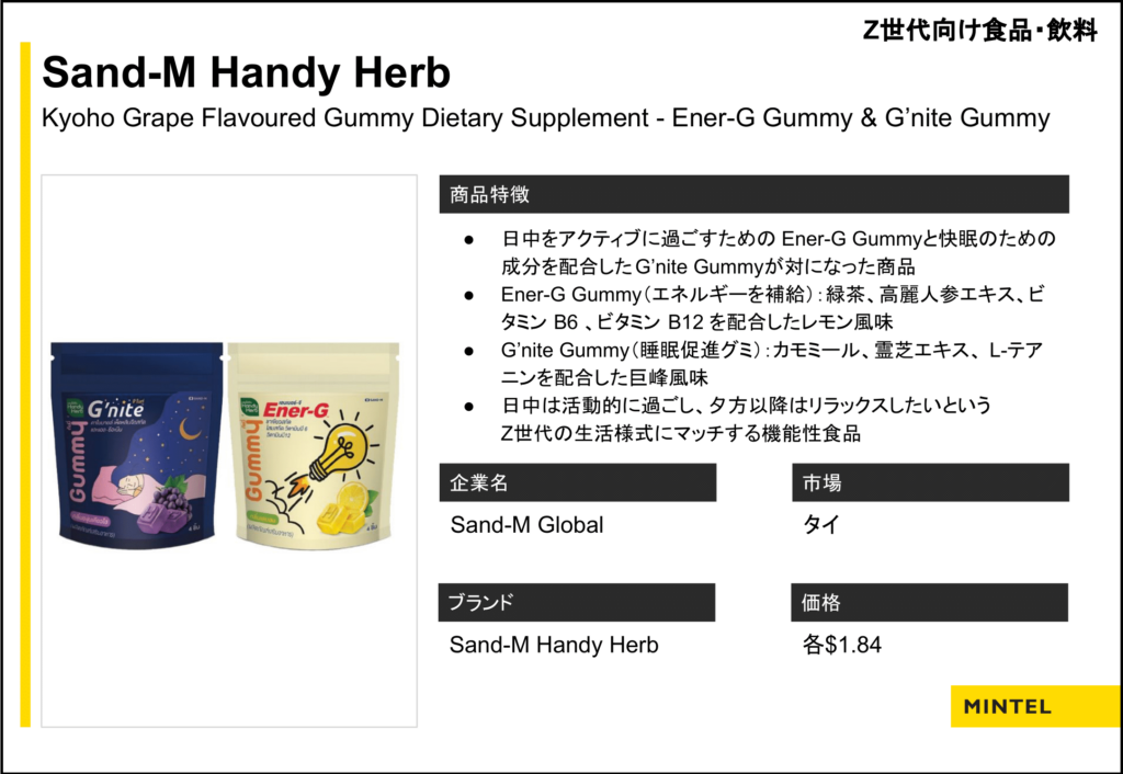 「Z世代はスマホの使用により最も精神状態が安定しない世代と言えます。アメリカの18~26歳のうち、心の健康を改善したいと考えている消費者の割合は54%で身体的健康(42%)よりも上回り、『コロナ禍の2021年に鬱を経験した』と回答した日本の18~24歳は59%でした。彼らは上の世代よりも、食生活に気分の向上を求めており、食品・飲料に心の健康の改善を期待しています(上記の図:食生活で気分を向上させたい日本の18~24歳は35%、世界では39%に対し、25歳以上ではそれぞれ26%と29%)。また、彼らは『食べても罪悪感のないご褒美になるおやつ』も求めています。Z世代を対象とするブランドは、長期的な健康上のメリットよりも、簡単に健康を実現できる商品でZ世代を惹きつけると良いでしょう。」と提案し、いくつかの国内外からの製品例を示しました。
