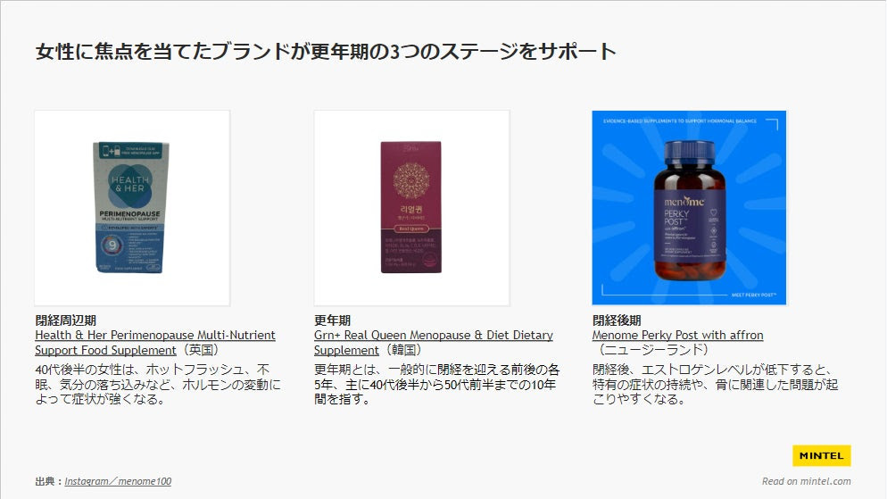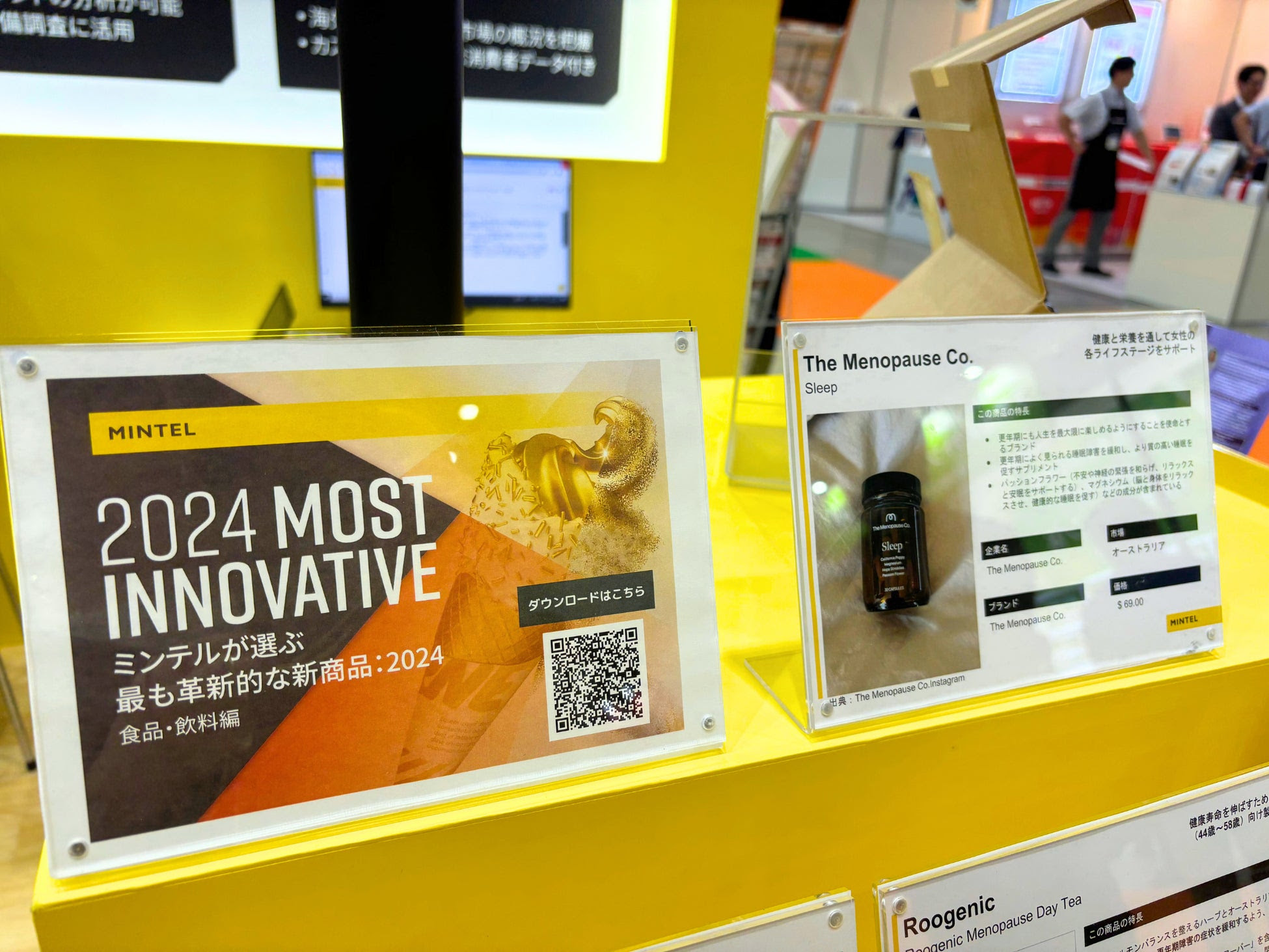 海外では、更年期を前期・中期・後期と分けて、それぞれの段階で生じる不調に対処する成分を配合したサプリ の製品開発が見られます。またサプリではなく、 日常的に摂取しやすいお茶やグミという形状で、こういった症状をサポートする商品も販売されています。ifia JAPAN 2024では、ミンテルのレポートでご紹介している、同分野の海外製品を展示しました。