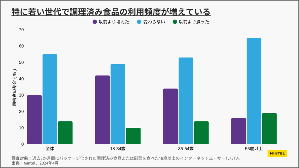 ミンテルのレポート「Prepared Meals – US – 2024」によると、2024年のアメリカの調理済み食品の総売上高は197億ドルでした。2023年と比較すると1%減少していますが、2029年までの売上高は11%の成長が予測されています。このように調理済み食品の利用が広がっている一方で、一人の消費者が利用している調理済み食品の種類はかなり限定的であり、まだまだ開拓の余地があると言えるでしょう。また調理済み食品利用者の利用頻度について、「以前より増えた」と回答した人のほうが「以前より減った」と回答した人に比べると多く、特に若い世代では約4割が以前より多く利用しています。