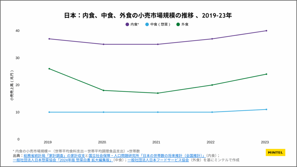 出典: 総務省統計局「家計調査」の家計収支と国立社会保障・人口問題研究所「日本の世帯数の将来推計(全国推計)」(内食);一般社団法人日本惣菜協会「2024年版 惣菜白書 拡大編集版」(中食);一般社団法人日本フードサービス協会(外食)を基にミンテルで作成