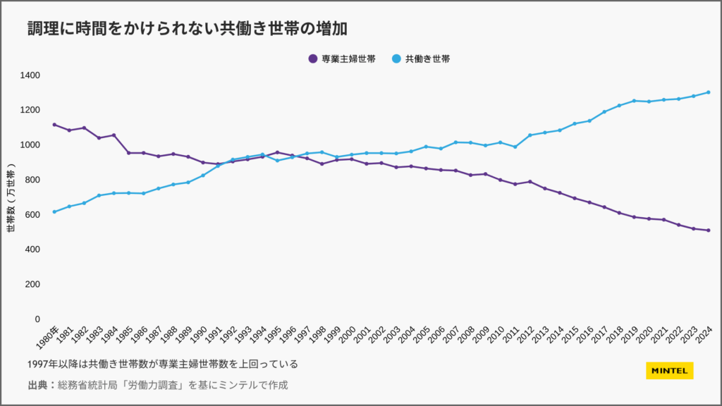 市場調査会社Mintel Groupの日本法人であるミンテルジャパン(東京都千代田区)が発表した「内食・中食・外食のトレンド ‐ 日本 ‐ 2025年」では、共働き世帯の増加やライフスタイルの多様化により、料理や家事に十分な時間を割けない家庭が増えていることから、世界中で食における“利便性・効率性”志向が一層強まっていることを明らかにしました。さらに「満足感」や「人とのつながり」といった心理的・感情的価値へのニーズも、合わせて高まっていることが示されています。