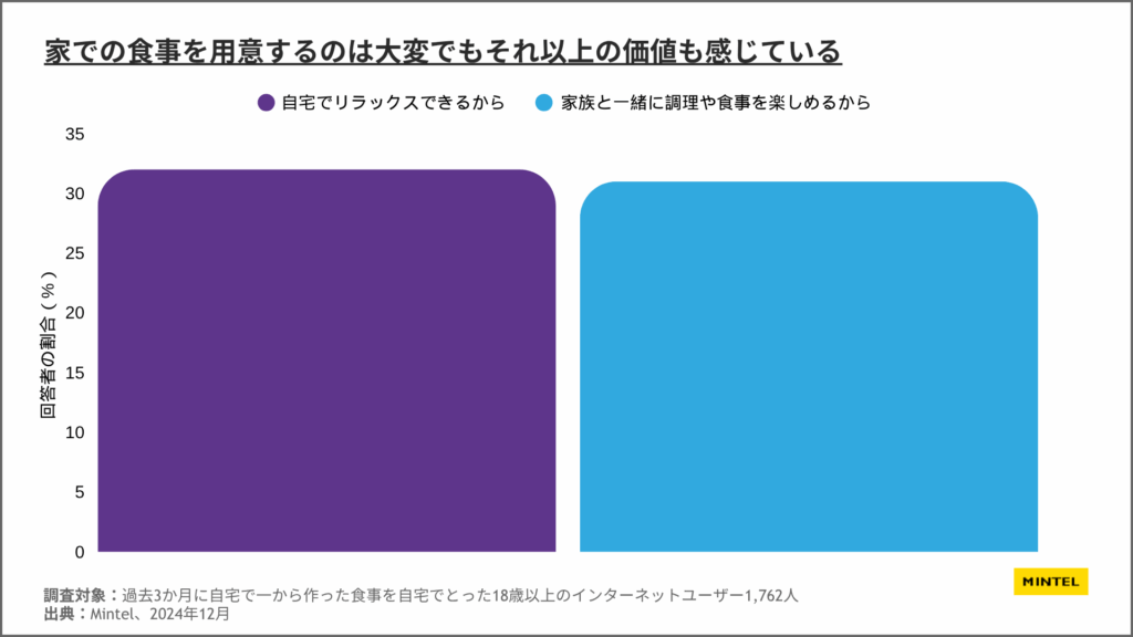 日々の食事作りを負担に感じている消費者が多い一方で、自宅で食事を作って食べる時間はリラックスできる時間であり、家族とコミュニケーションを取る大切な時間であるとも考えられています。こうした背景を受け、子どもと一緒に「ひと手間」を楽しめる商品や、家族の絆を深める食卓体験など、「効率性」と「心理的・感情的価値」の両立を実現する商品開発が新たなビジネス機会を創出すると分析しています。