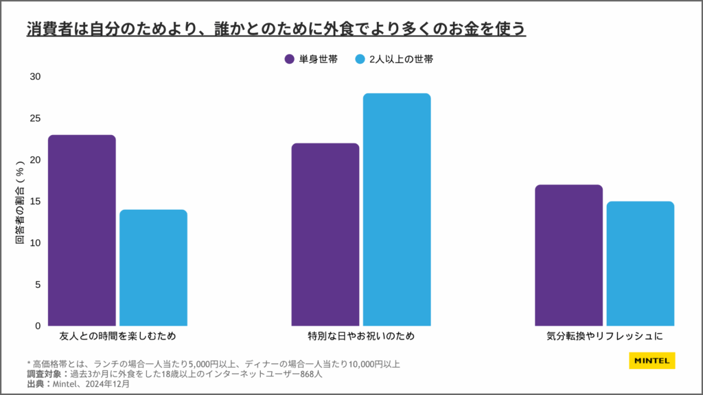 さらに外食においては「誰かとの時間を共有するため」に、より多くのお金を使う傾向があると考えられます。実際に、高価格帯の飲食店を利用する理由として、気分転換やリフレッシュといった自分自身の目的より、友人との時間を楽しむためや、特別な日・お祝いのために利用するケースが多く見られます。