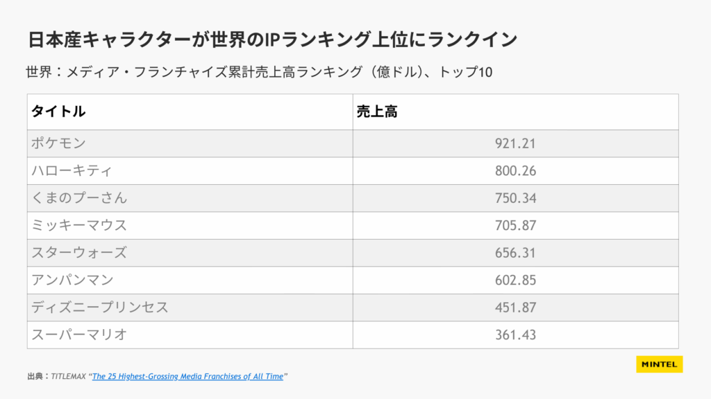 情報の出典元として【ミンテルジャパンレポート『キャラクター等とのコラボレーション(IPビジネス) – 日本 – 2025年』より】の明記をお願いいたします。