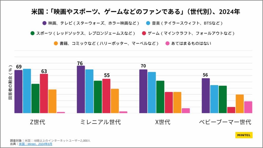 世代別に見ると、映画や音楽関連のファンは幅広い世代にわたっていますが、ゲーム関連のファンについては、Z世代およびミレニアル世代の回答が多い結果となりました。