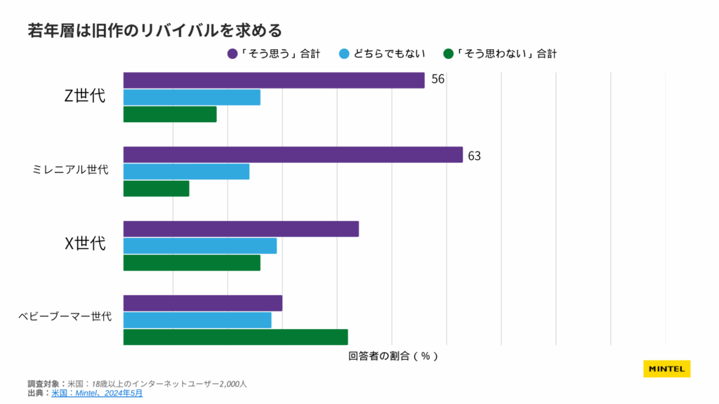 アメリカでは、Z世代・ミレニアル世代の半数が「旧作キャラを最新技術で再現し、新エピソードなどで復活させてほしい」と熱望しており、過去のIPを活用した新しいニーズが浮上しています。