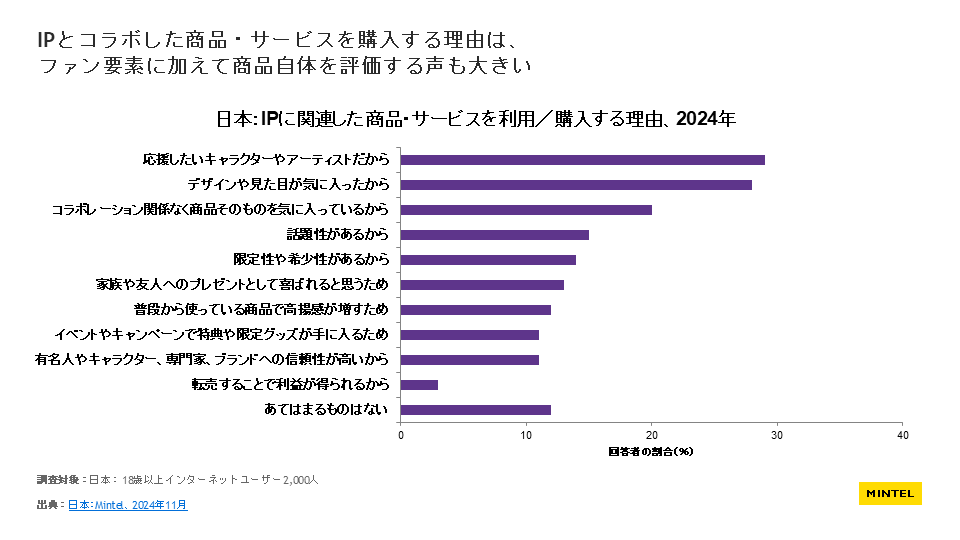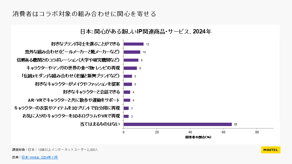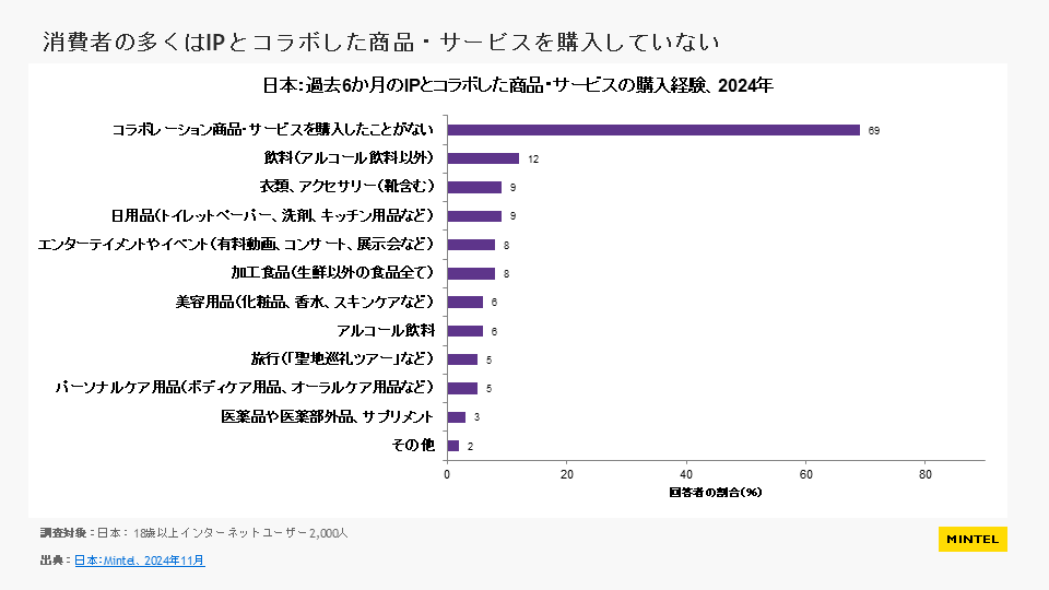 ※本リリースの調査結果をご利用いただく際には、必ず【ミンテルジャパンレポート「キャラクター等とのコラボレーション(IPビジネス) – 日本 – 2025年」より】とご明記ください。