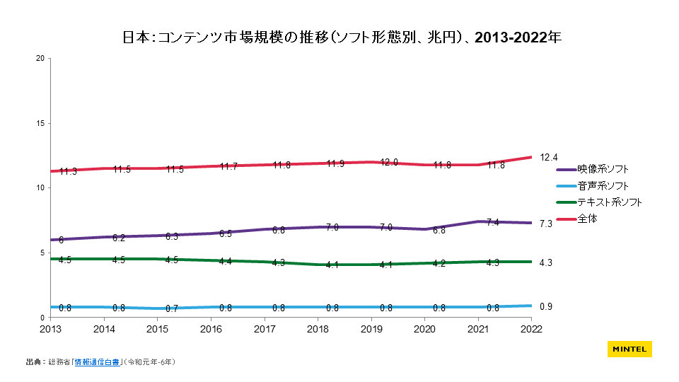 国内コンテンツ市場は緩やかに成長しており、総務省「情報通信白書」では、2022年時点の「コンテンツ市場」の規模を約12兆円と推定しています。