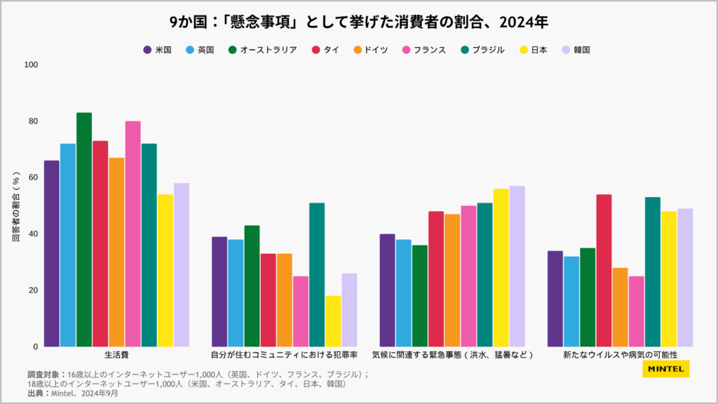 ミンテルのグローバル消費者調査(2024年9月実施)の結果は、世界各国の消費者にとって、「生活費」が最も顕著な懸念事項であることを示しています。