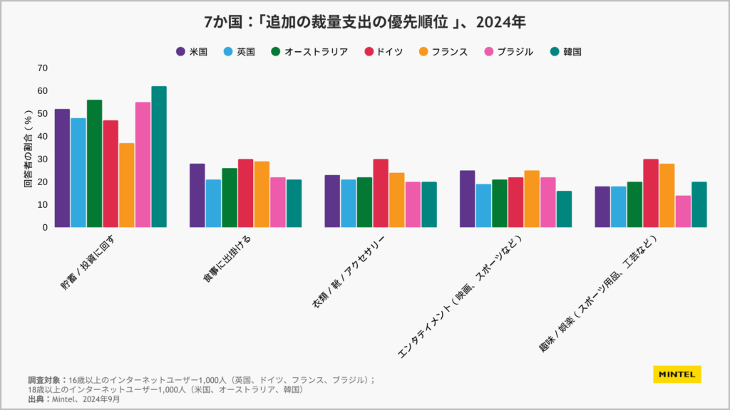 「追加の裁量支出の優先順位」を見ると、世界各国で大半の消費者が、自由裁量で使えるお金の使い方として「貯蓄・投資」を優先しており、節約志向の高まりがうかがえます。