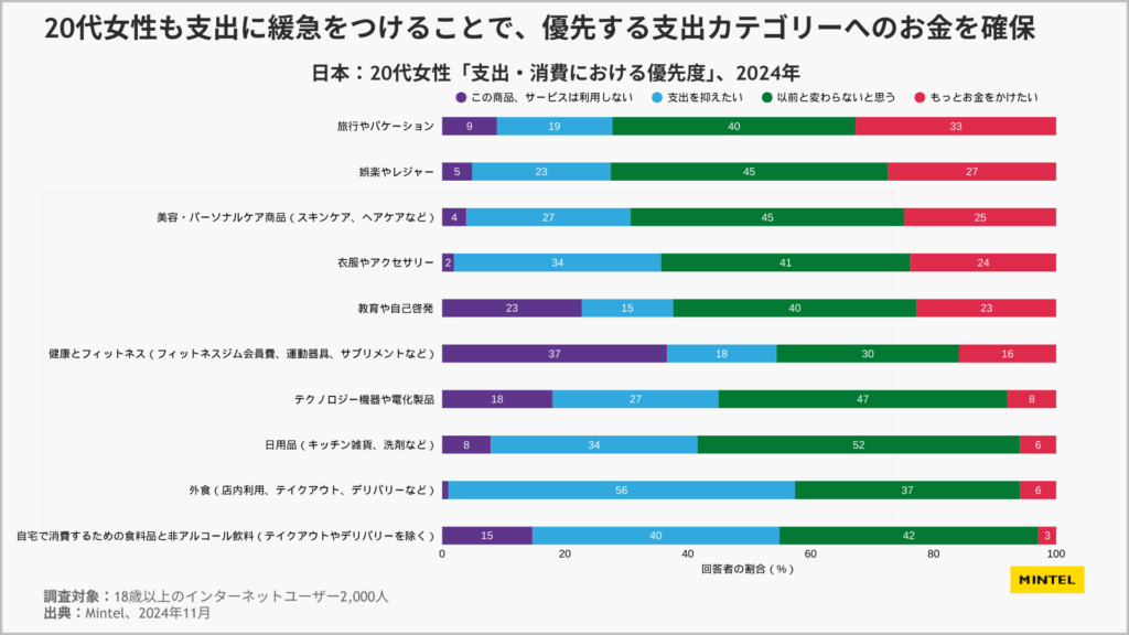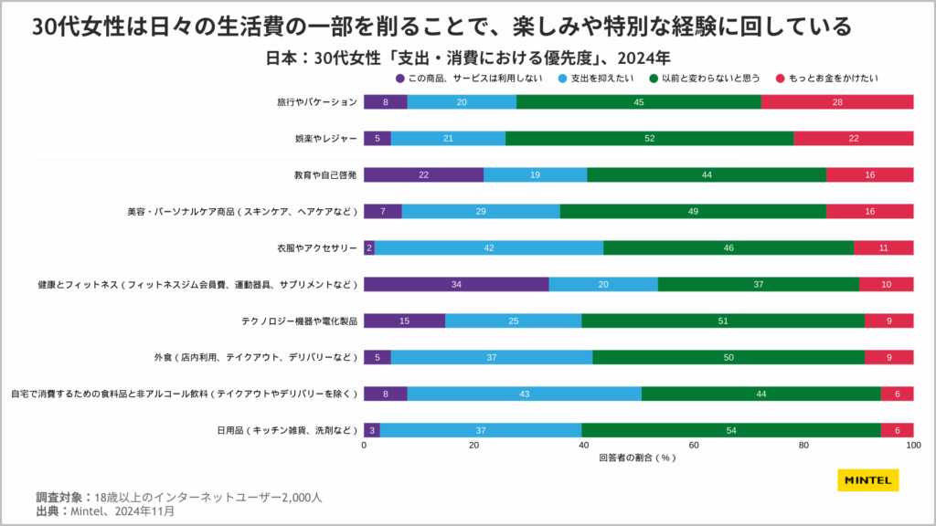 さらに、30代女性は全体に比べて「旅行やバケーション」「娯楽やレジャー」へ積極的に支出する意向が見られます。一方、家での食事や健康・フィットネスへの支出を抑えたい人の割合が高く、日々の生活費を削ることで、楽しみや特別な体験のために使うお金を捻出している姿がうかがえます。