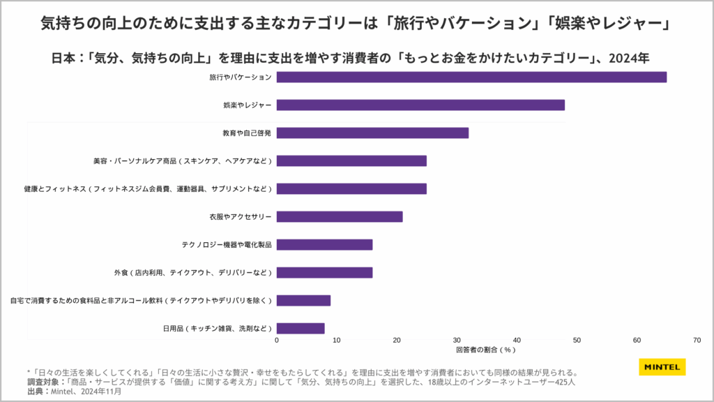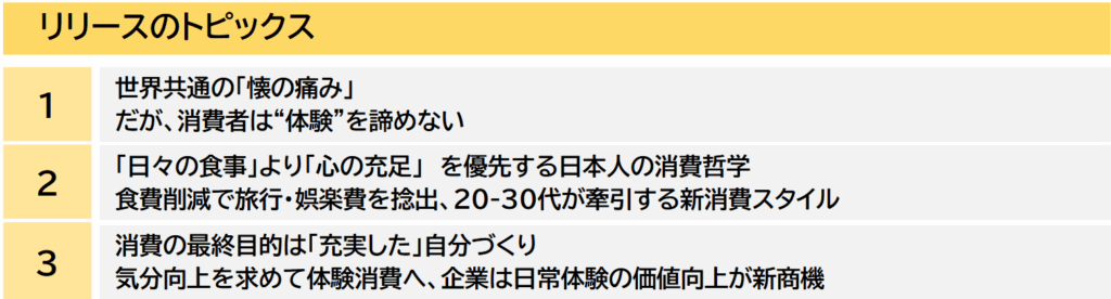 世界的に「生活費」が最大の懸念事項となる中、日本の消費者は、特に日々の生活費(例えば家での食事、外食、日用品)を徹底的に切り詰めており、節約によって生み出されたお金をは、旅行・娯楽といった体験のために支出をしたいという強い意向がうかがえます。これらの調査結果から、「気分・気持ちの向上」を重視し、限られた予算の中で満足度の高い体験を追求する新しい消費スタイルが浮き彫りとなりました。