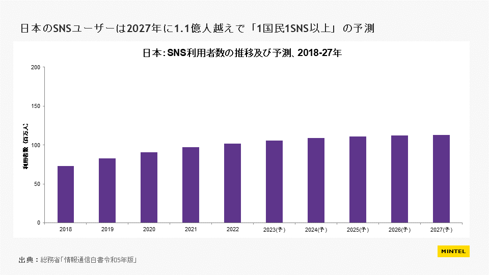 インフルエンサーマーケティング関連の市場が今後も継続する中、短期的にはSNSユーザー数も右肩上がりの増加を継続すると考えられます。総務省の「情報通信白書令和5年版」によると、SNS利用者は2027年に1億1,300万人に達し、国民一人当たり1つ以上のSNSを利用することになります。
