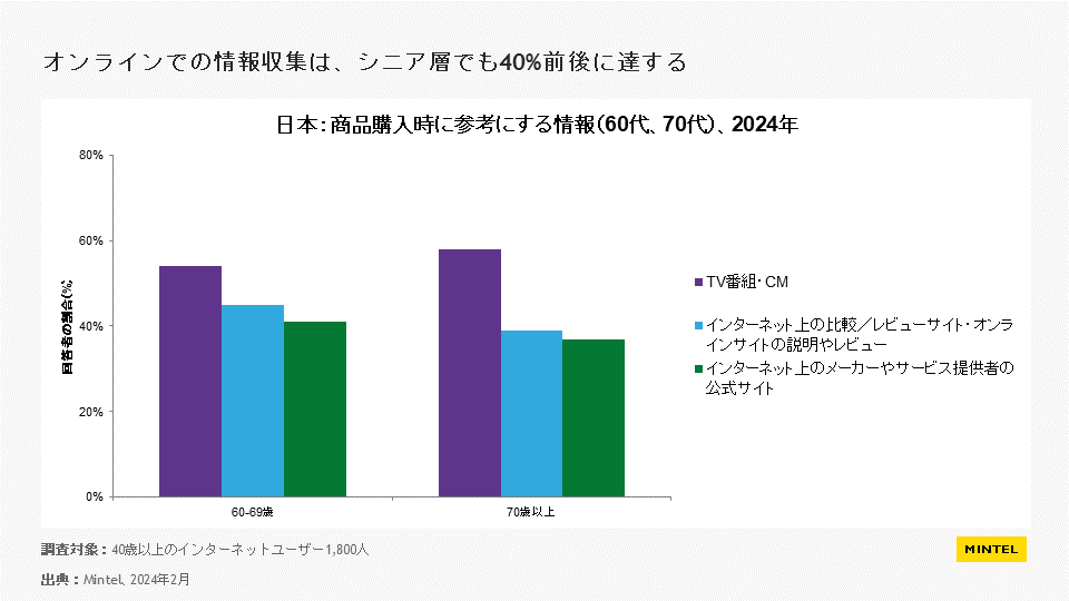そして、日本の高齢者層の多くは、既に情報収集の手段の一つとしてオンラインの活用を受け入れています。ミンテルジャパンレポート「シニアのライフスタイル – 日本 – 2024年」でも述べられているように、シニア層(60歳以上)では、商品購入の際に参考とする情報源として、オンラインを挙げる回答は40%前後に達し、最も多い情報源のテレビに次ぐ回答となっています。彼らの直近1年間の支出の変化を見ると、飲食やヘルスケアなどの支出が伸びています。これらに関連する情報の収集においても、インフルエンサーを活用した説得力のある情報が提供された場合、新たな情報源としてインフルエンサーを認知するシニア世代の増加につながるでしょう。