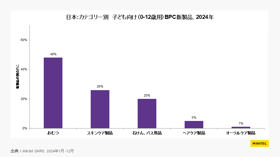 ミンテル世界新商品データベース(Mintel GNPD)に登録されたデータを見ると、日本では「子ども用」と銘打ったケア新製品の割合は少なく、子ども用BPCカテゴリー新製品のほぼ半数が「おむつ」となっています。