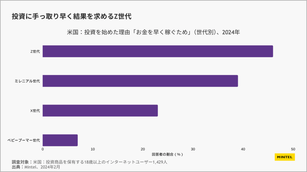 学生時代に新型コロナの感染拡大による社会・経済の混乱を経験した若年層は、将来への漠然とした不安とともに、経済的な自立を強く意識しています。ドイツの18~24歳の消費者の過半数が「経済的安定」を最も懸念する項目に挙げ、アメリカでは同年代の7割近くが「起業に関心がある」と回答しています。 またオンラインで効率的に情報を集めるZ世代は成果も効率的に求める傾向があり、投資を始めた理由を尋ねると、「お金を早く稼ぐため」と回答したのはZ世代が最多となりました。デジタル世代の若年層の中には効率よく収益を上げるタイパやコスパ思考を金融サービスに求めている人も見られます。