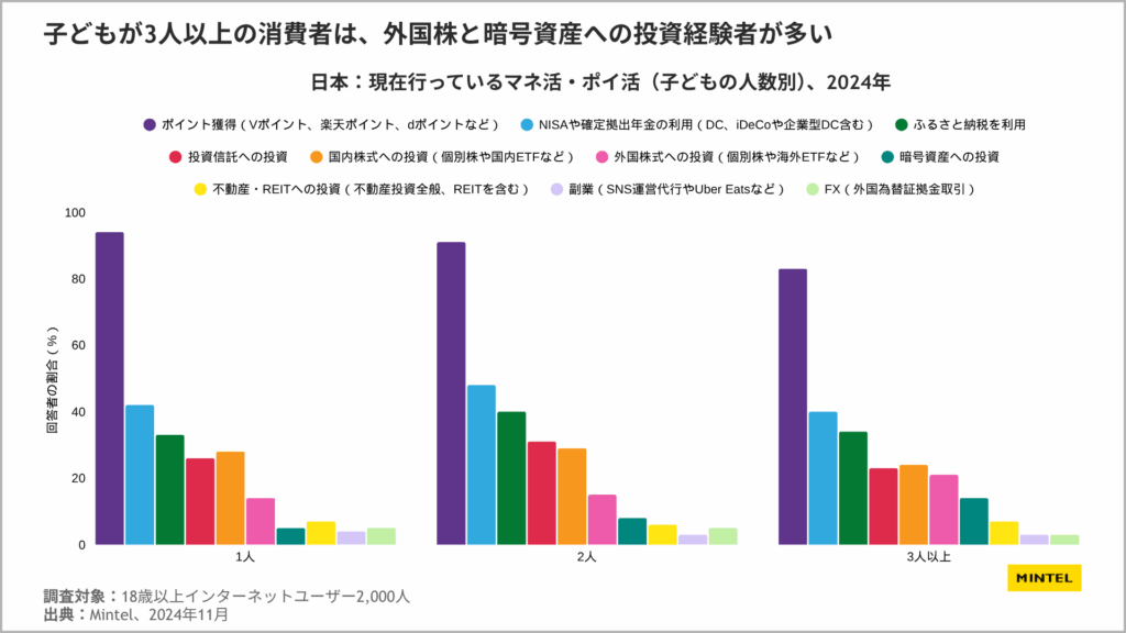 ミンテルが本レポートのために行なった消費者調査によると、子どもの人数が増えるにつれてコスト削減や高リターンを狙う行動が増えていることが明らかになりました。3人以上の子どもを持つ家庭では外国株や暗号資産への投資率が高く、教育費や生活費をカバーする必要性から、リスクを取ってでも養育コストをカバーしようとする姿勢が見られます。