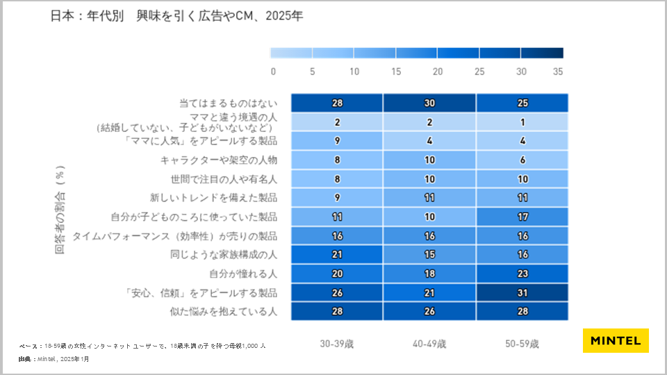 ミンテルの調査において、18歳未満の子どもを持つ母親の4人に1人が「自分と似た悩みを抱えている人」が登場する広告やCMは興味を持つと回答しており、次に「安心、信頼」をアピールする製品と続いています。