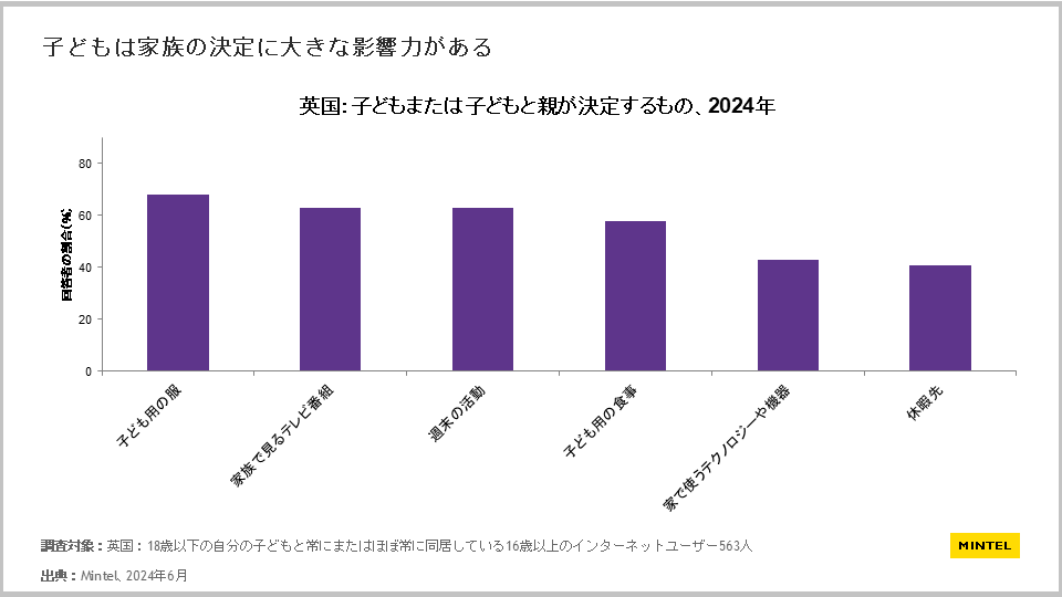 また、イギリスにおける調査でも、多くの項目で親の過半数が子どもを家族の決定に関与させています。服、テレビ番組、週末何をするかは、6割以上の親が、子どもまたは子どもと親が決定していると回答しました。